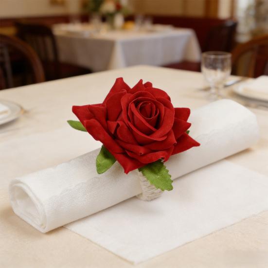 Enhance your dining experience with these elegant fabric rose napkin rings, crafted with soft flax rope that resists deformation and ensures durability. Featuring a realistic three-dimensional rose design available in multiple colors, these artificial flower napkin rings add a delicate, sophisticated touch to any table setting.