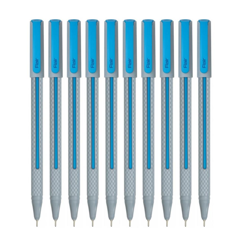 Pack of 10 Flair Yolo ball pens with 0.6mm blue ink for smooth, precise writing.