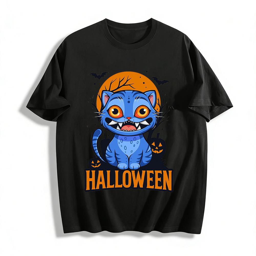 Halloween Spooky Blue Cat Print T-shirts for Adults Kids Casual Crewneck Tops Holiday Tees Pure cotton T-shirt