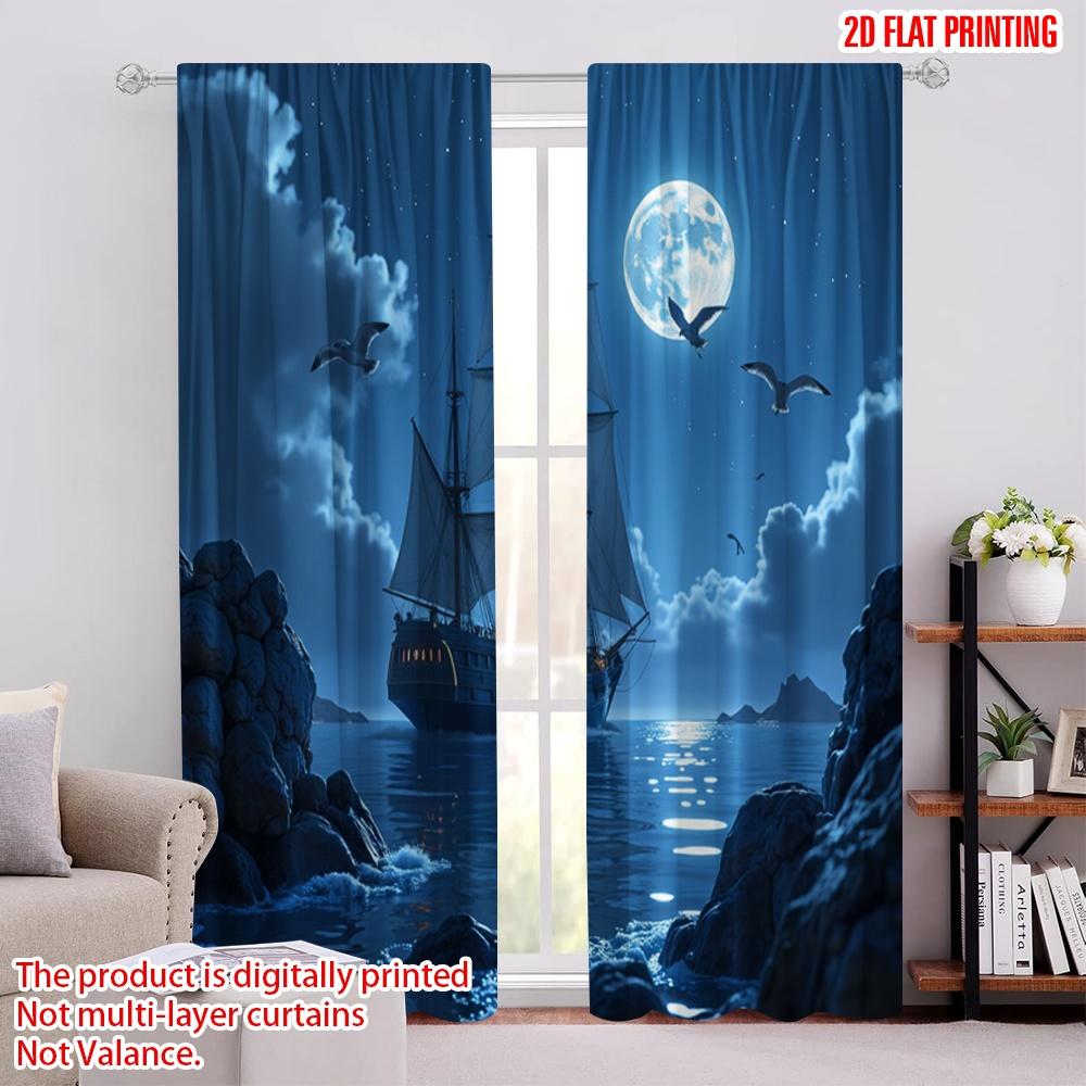 Flat Printing Window Curtains Moonlit Ship Polyester Without Electricity Family Party Decoration Suitable Home Curtain Set Of 2 Made Washable