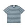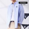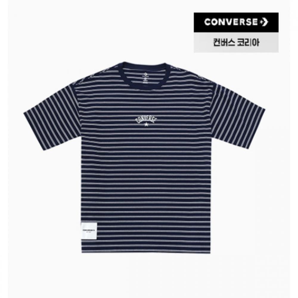 The Converse UCJ690-695 Men's Women's Stripe Logo Loose Fit T-Shirt comes in Obsidian color and features a relaxed loose fit design. The striped pattern and front and back embroidered logo details provide a stylish appearance, suitable for all genders.
