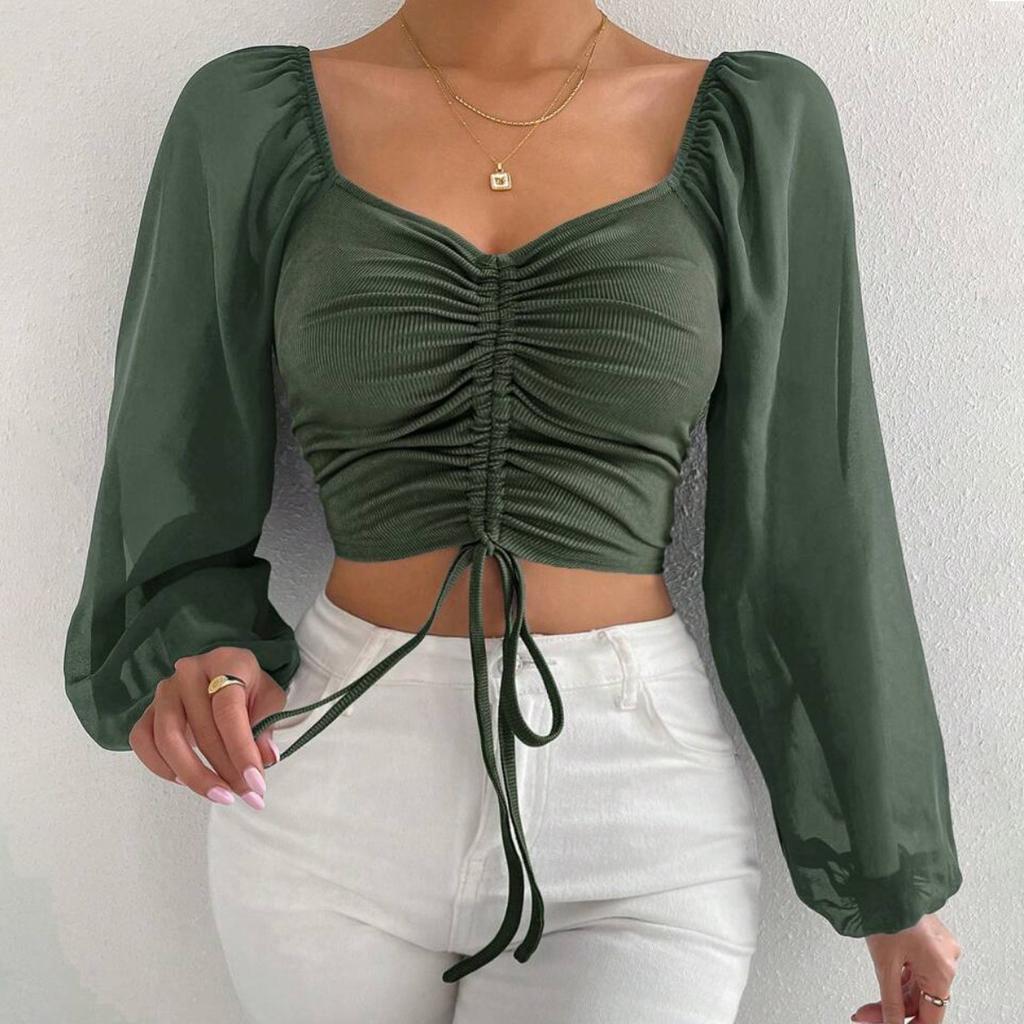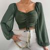 Women's Sweetheart Neck Drawstring Puff Sleeve Cropped Top, French Style Casual Blouse for Women, European American Fashion