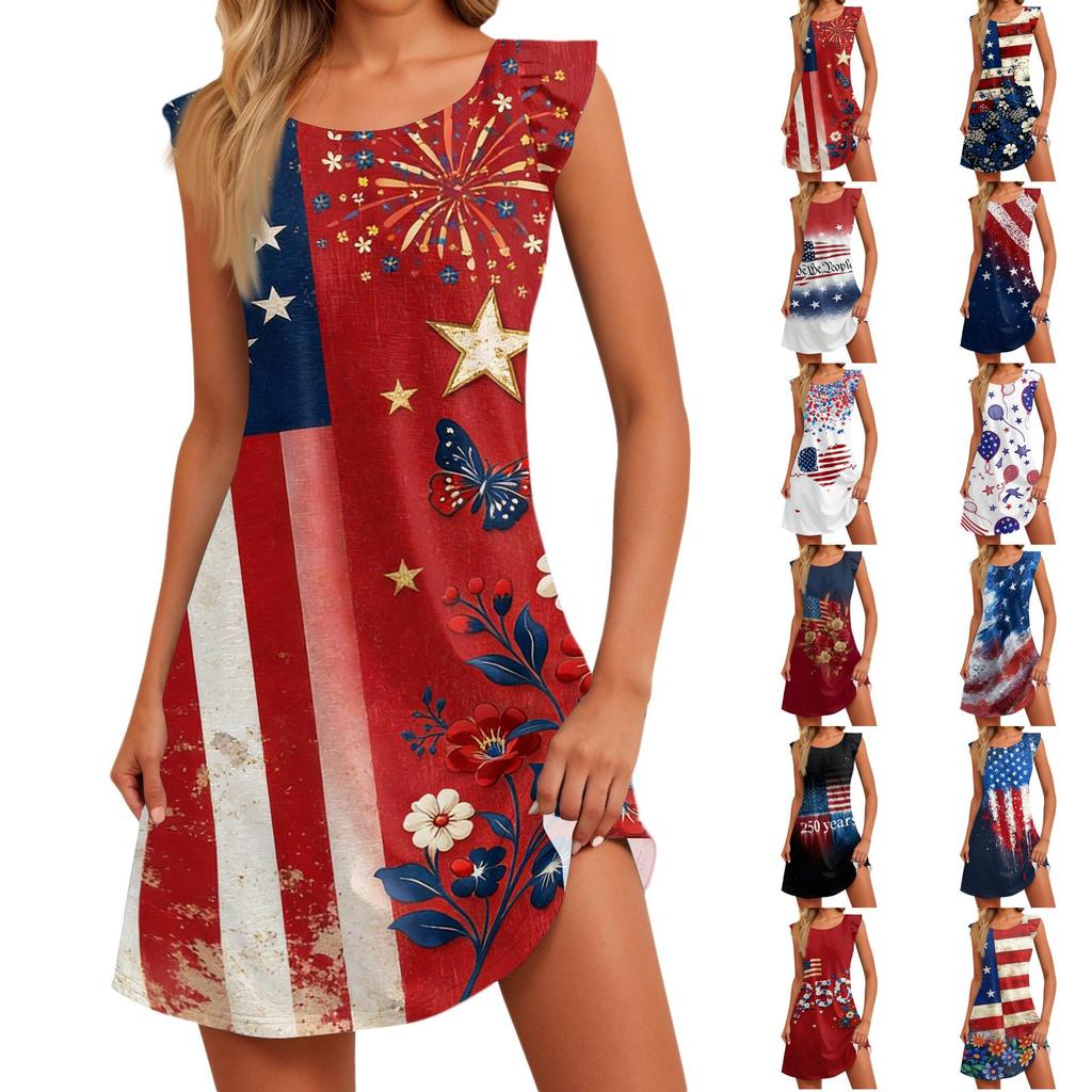 Women's Casual Round Neck Flying Sleeve Independence Day Print Dress