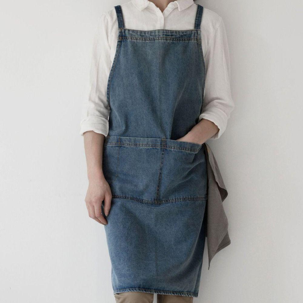 Vintage Oil-Proof Ladies Denim Apron Cleaning Washed Denim Advertising Apron Unisex Thicken Barber Work Clothes Home Kitchen