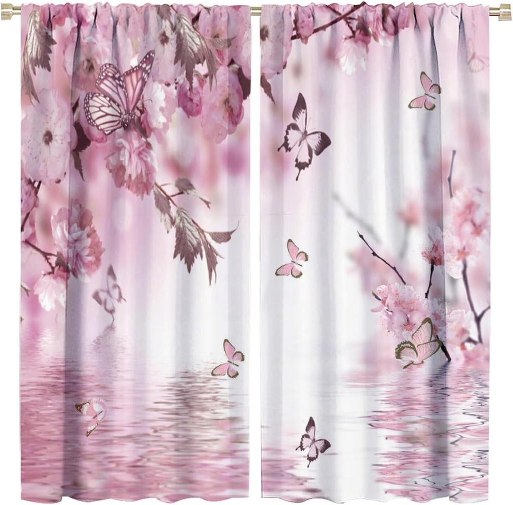 Pink Tropical Cherry Blossom Curtains Beautiful Summer Jungle Orchids Hibiscus Butterfly Window Drapes Darke Curtain With Rod Pocket Polyester