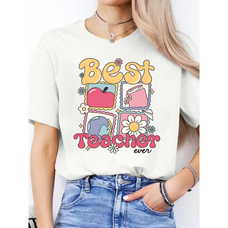 Spanish Letter Print Spring Summer Casual Round Neck Short Sleeve Sports T-Shirt Women's Top