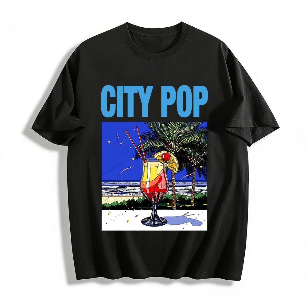 Retro City Pop Style Seaside Cocktail Print T-Shirt Casual Vacation Unisex Top For Summer Pure cotton T-shirt