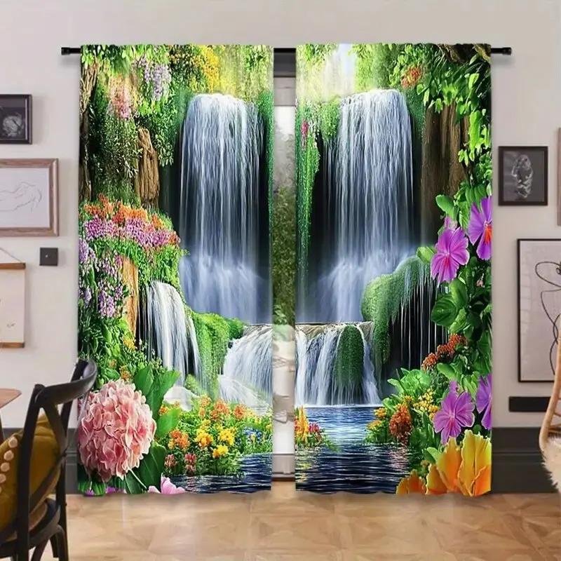 Modern Waterfall Scenery Pole Bag Curtains Bedroom Living Room Decoration Home Curtain Polyester Ideal For Area