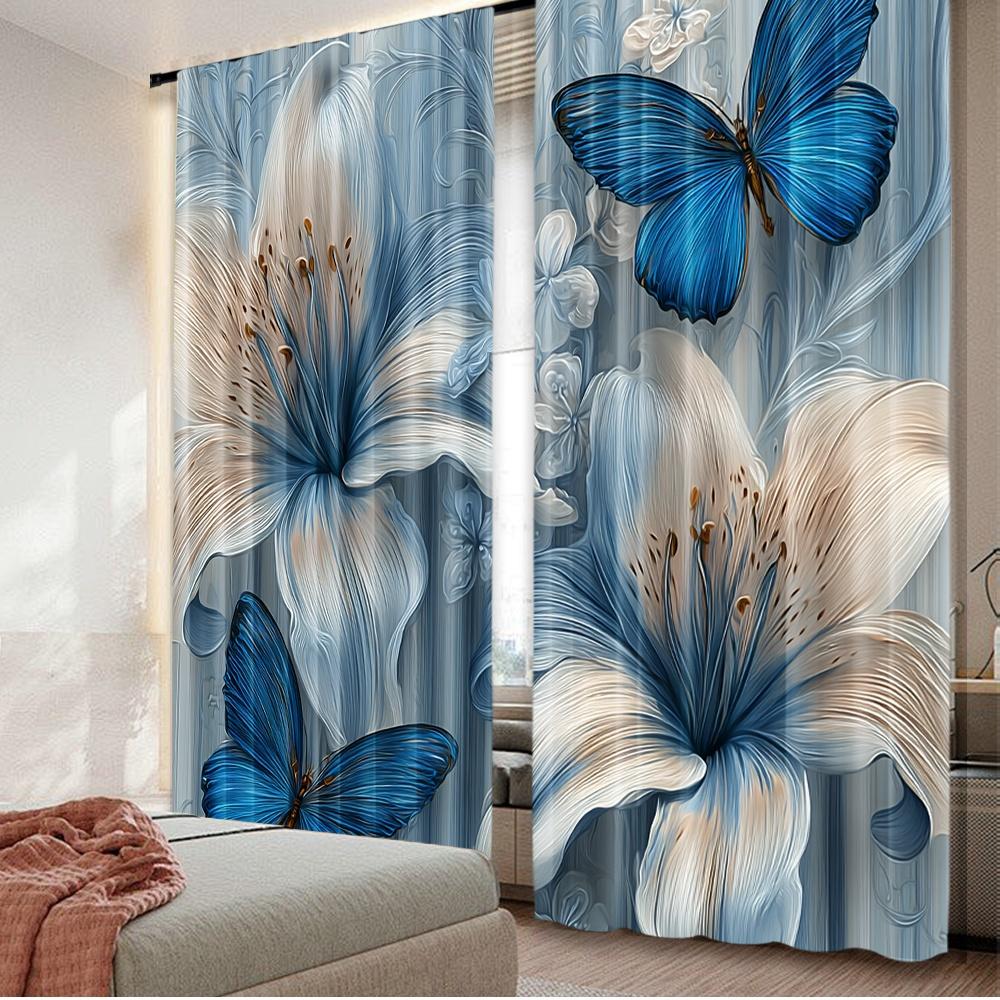 Set Of 2 Flat Printing Window Curtains Blue Blooms Digital Printed Polyester Drapes Festive Home Wall Yard Use Curtain Made