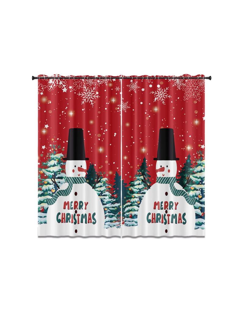 Christmas Snowman Print Red Curtains Multiple Sizes Living Room Insulation Decoration Easy Install Curtain Light Blocking For Polyester Machine