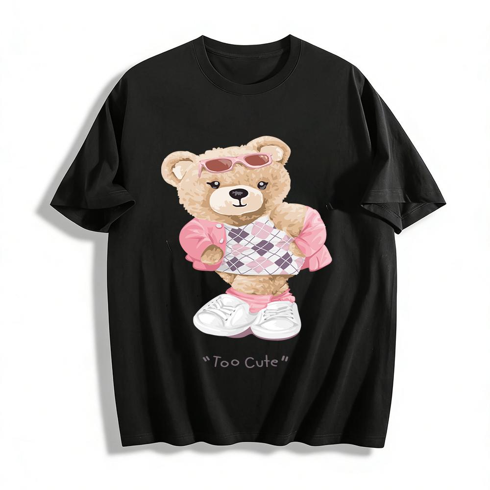 Trendy Cute Bear Print Top Retro Argyle Pink Style Unisex Loose Casual Comfortable T-Shirt Pure cotton T-shirt