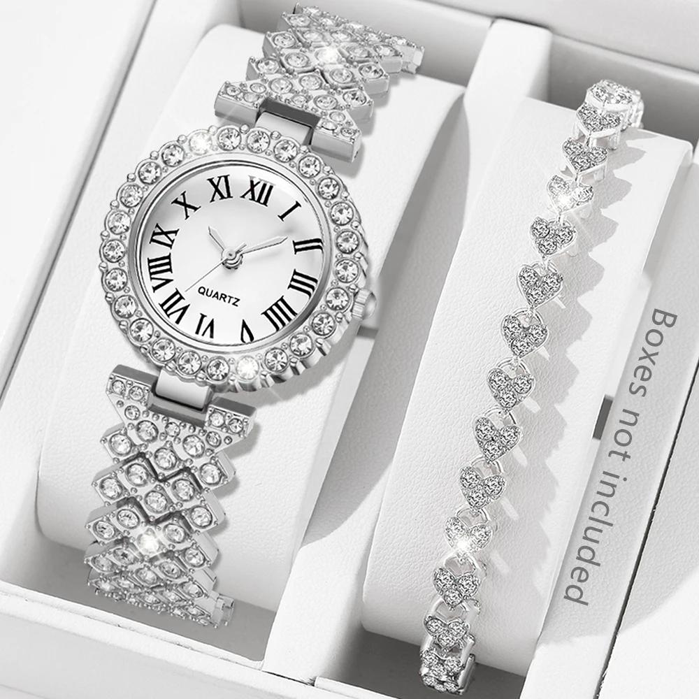 2-piece Ladies' Roman Scale Full Diamond Quartz Watch Heart Bracelet Accessory Set Suitable For Daily Wear