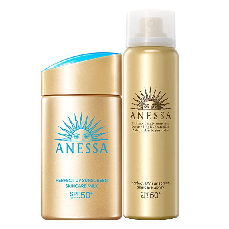 Protect your skin with the Anessa Perfect UV Sunscreen Milk & Spray Set. This powerful duo features a 60ml SPF50+ PA++++ sunscreen milk and a 60g sunscreen spray, offering high-level, waterproof, and sweat-proof protection for your face. Made in Japan, it's designed for superior defense against UV rays.