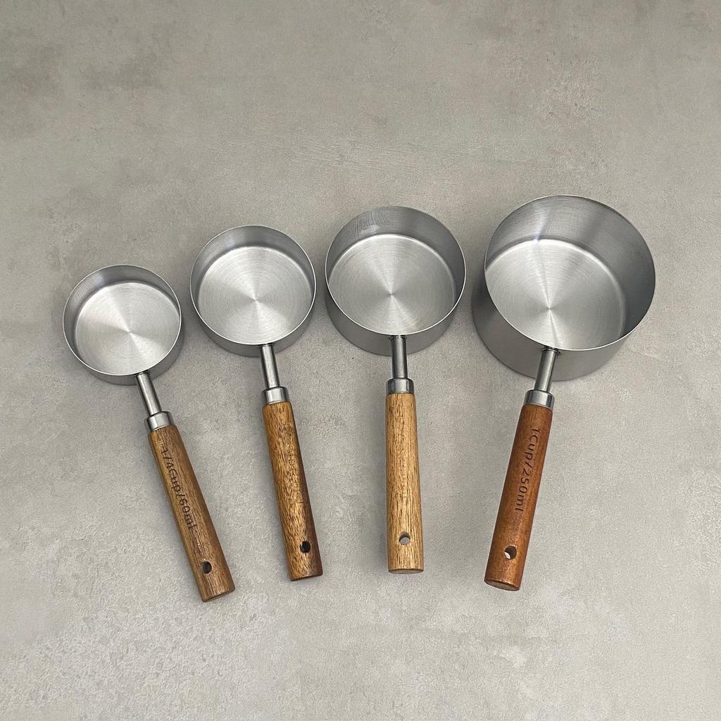 4Pcs Wooden Handle Stainless Steel Measuring Cups Spoons Baking Tools Coffee Measuring Spoon Set Bartending Scale Accessories
