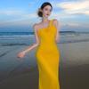 and American Style Foreign Trade Long Dress for Travel and Vacation Photoshoots, Sexy Off-Shoulder Strapless Waist-Cinching Mesh Mermaid Dress