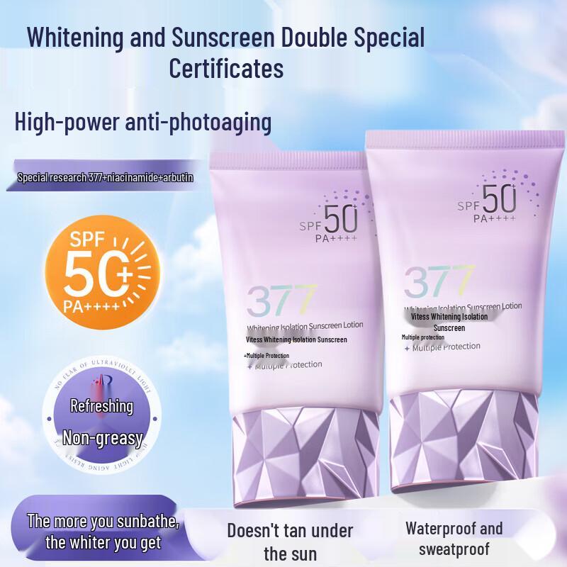 Discover the multi-benefit WTS 377 Whitening Tone-Up Sunscreen Lotion, 50g. This formula offers effective sun protection while working to brighten your complexion with its 377 whitening ingredient. The delicate pink-purple tint helps to color-correct and tone up skin, providing a smooth, radiant base. It also acts as an isolation barrier, protecting skin from daily environmental factors. Ideal for achieving a luminous and even skin tone.
