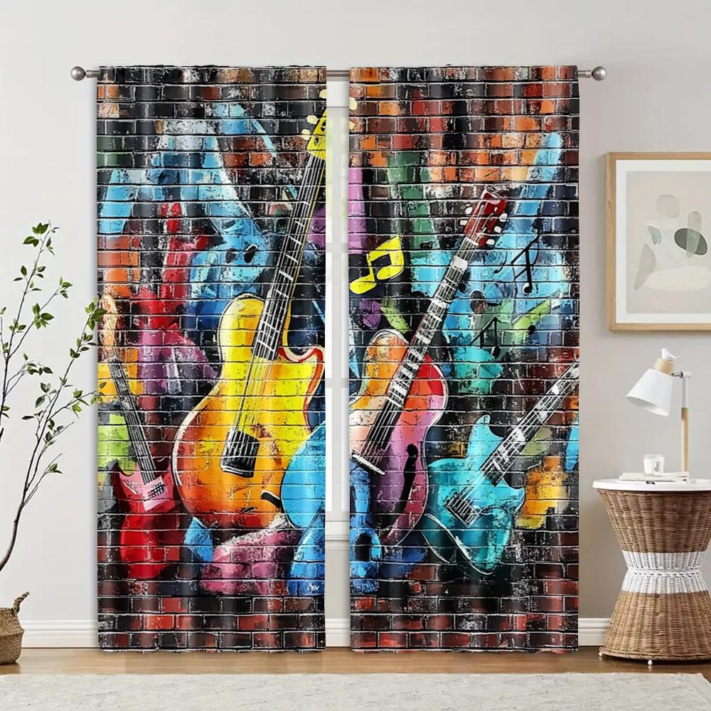 Set Of 2 Filtering Curtains Excluding Rods Non Movable Without Batteries Graffiti Brick Wall Music Theme Use Curtain Polyester