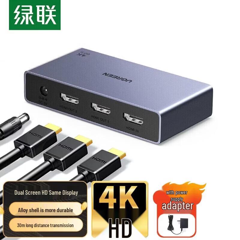 The UGREEN 4K HDMI Splitter 1x2 allows you to connect one HDMI source device, such as a computer, to two separate HDMI displays like monitors or TVs. It supports 4K high-definition resolution and enables simultaneous display on both screens, making it ideal for video splitting and expansion.