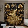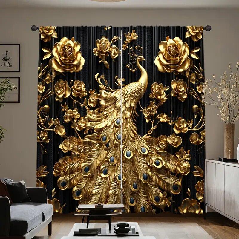 Set Of 2 Elegant Golden Peacock Print Curtains Pole Bag Home Decoration Room Curtain Polyester
