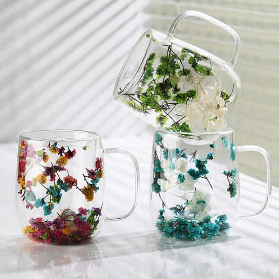 Double-Wall Dried Flower Glass Mug with Handle 350ml Borosilicate Glass Coffee Cup for Hot Cold Drinks Heat-Resistant Clear Unique Gift