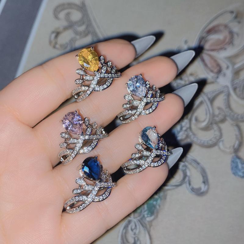2026 Colored Treasure New Product, Pear-shaped Water Drop Personalized Yellow Diamond Crown Ring Women, Fashionable Light Sea Blue Treasure Diamond