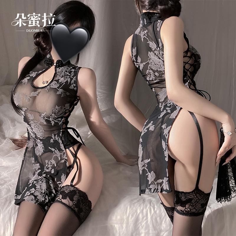 Domila sexy underwear new Chinese style improved cheongsam sexy see-through high slit ink style strap-on cheongsam woman