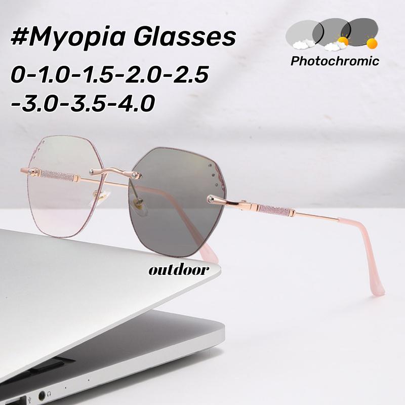 Light Sense Color Changing Rimless Diamond Cutting Edge Myopia Glasses Premium Sense Anti-Blue Light Ultra Light Myopia Glasses