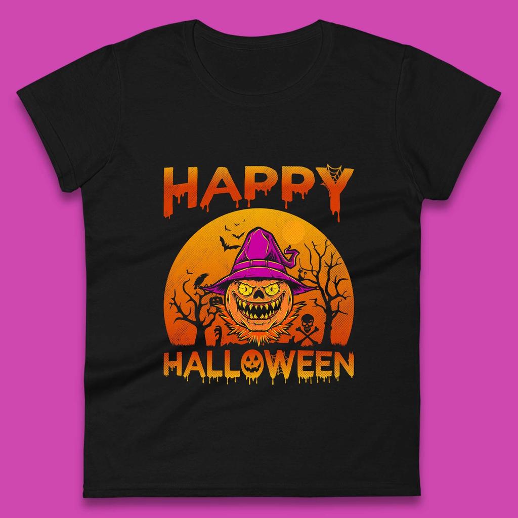 Happy Halloween Monster Pumpkin With Witch Hat Horror Scary Spooky Season Womens Tee T Shirt Mens Tops Unisex Top