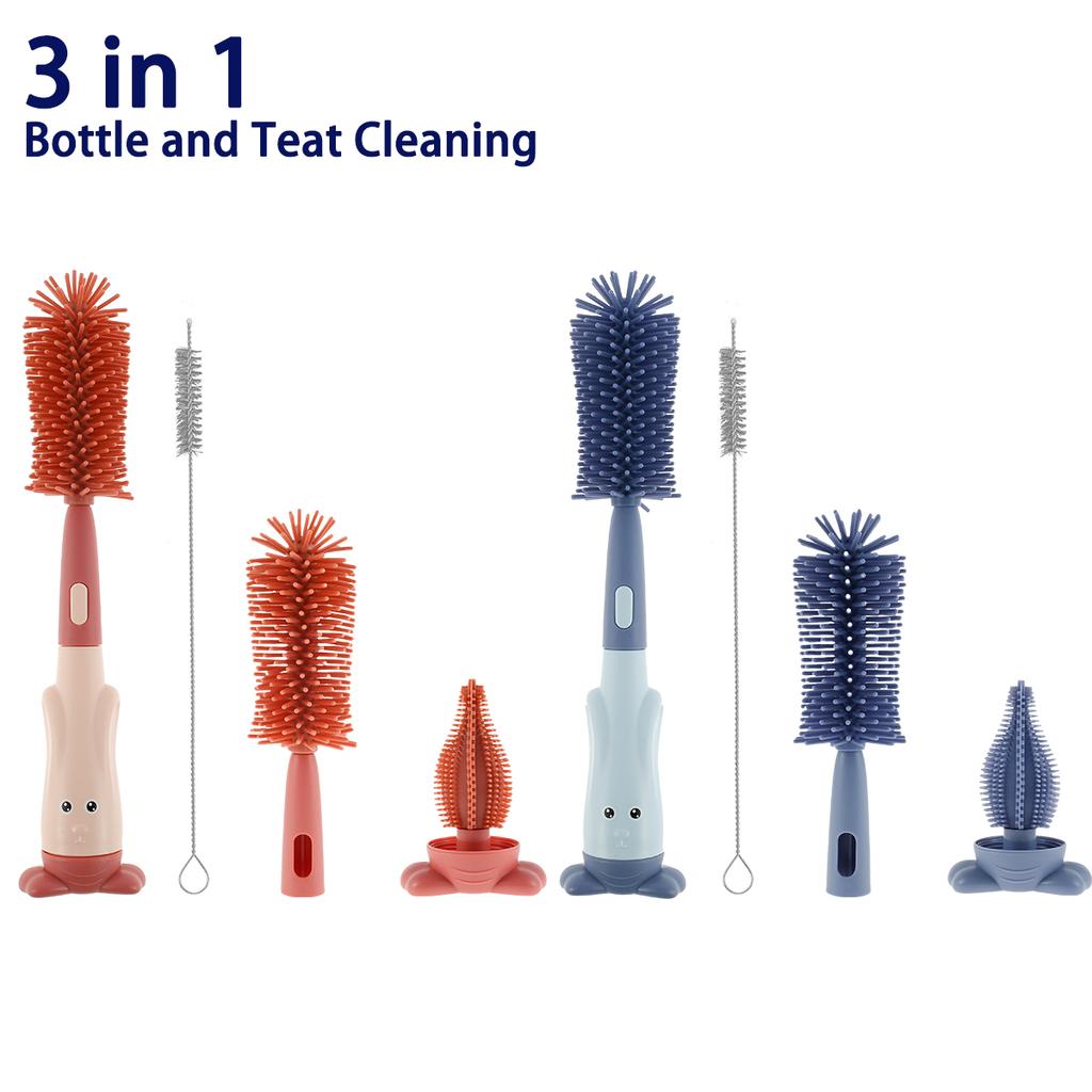 3 in 1 Baby Bottle Brush Set Lone Handle Silicone Bottle and Teat Cleaning Brush with Stand Portable Straw Cleaner Brush