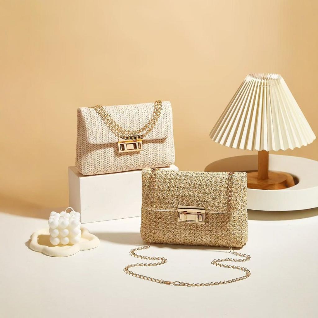 Sweet Style, Straw Weaving, Chains, Single-shoulder Bags, Crossbody Bags, Summer, Double-lock, Ladies, Handbag Bags