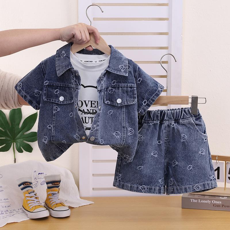 New Summer Outfit For Children: Stylish Girls' Denim Jacquard Short-Sleeve Three-Piece Set For Toddlers And Young Children