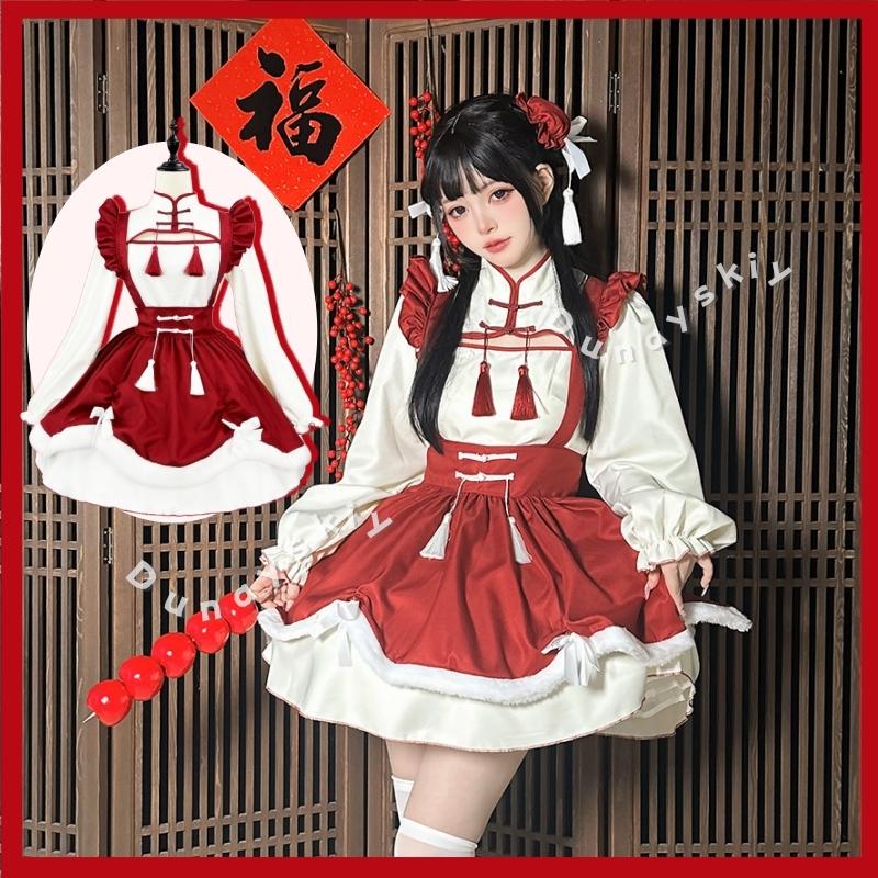 New Year's Yuanxiao Theme Cosplay Costume Lolita Frog Buttons Chest Cutout Maid Dress Costume Chinese Style Carnival Stage