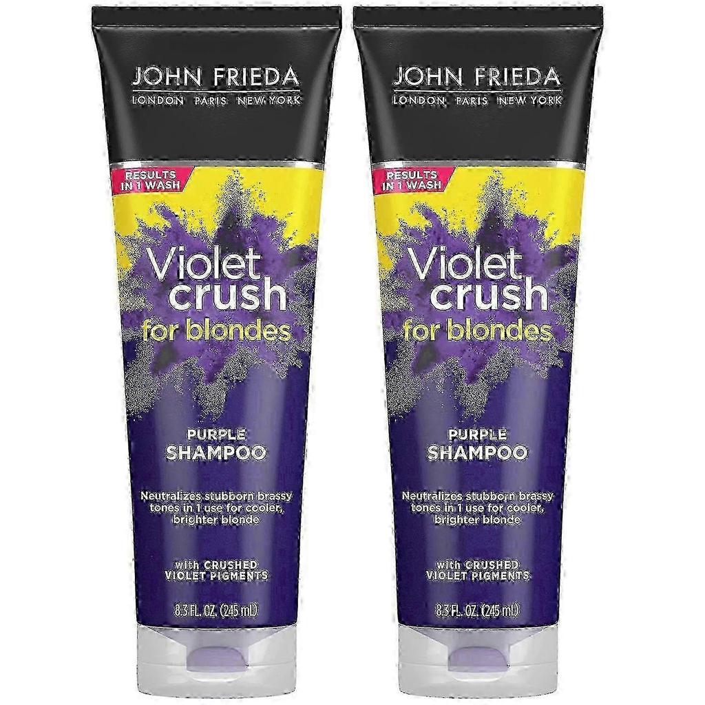 Extend your salon visits with John Frieda Violet Crush Shampoo. This two-pack brings our full hair routine to fix dull, brassy blonde hair. Get back to salon-worthy color with our unique formula, packed with powerful crushed violet and blue pigments. John Frieda Violet Crush Purple Shampoo helps to crush brassiness and harsh orange and yellow tones, for a cooler blonde. John Frieda Violet Crush Shampoo nourishes and restores hair hydration while providing a cooler, brighter blonde in as little as one wash. Watch your color return to a more natural-looking blonde. Use until desired color is achieved, and to maintain results, alternate with regular shampoo and conditioner. And don't worry about dryness