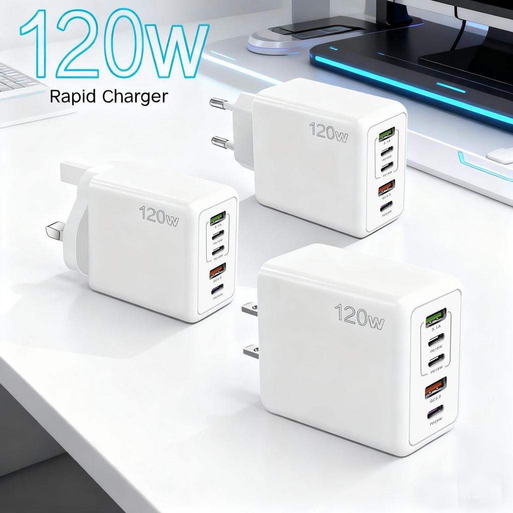 120W Fast Charger with 3PD+2USB Ports for Apple Devices, Compatible with EU/US/UK Standards