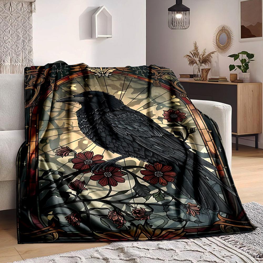 1pc Stained Glass Raven Blanket - Lightweight Flannel Fleece with Digital Printing, Soft Warm for Sofa, Travel, Camping, Office yy251018314