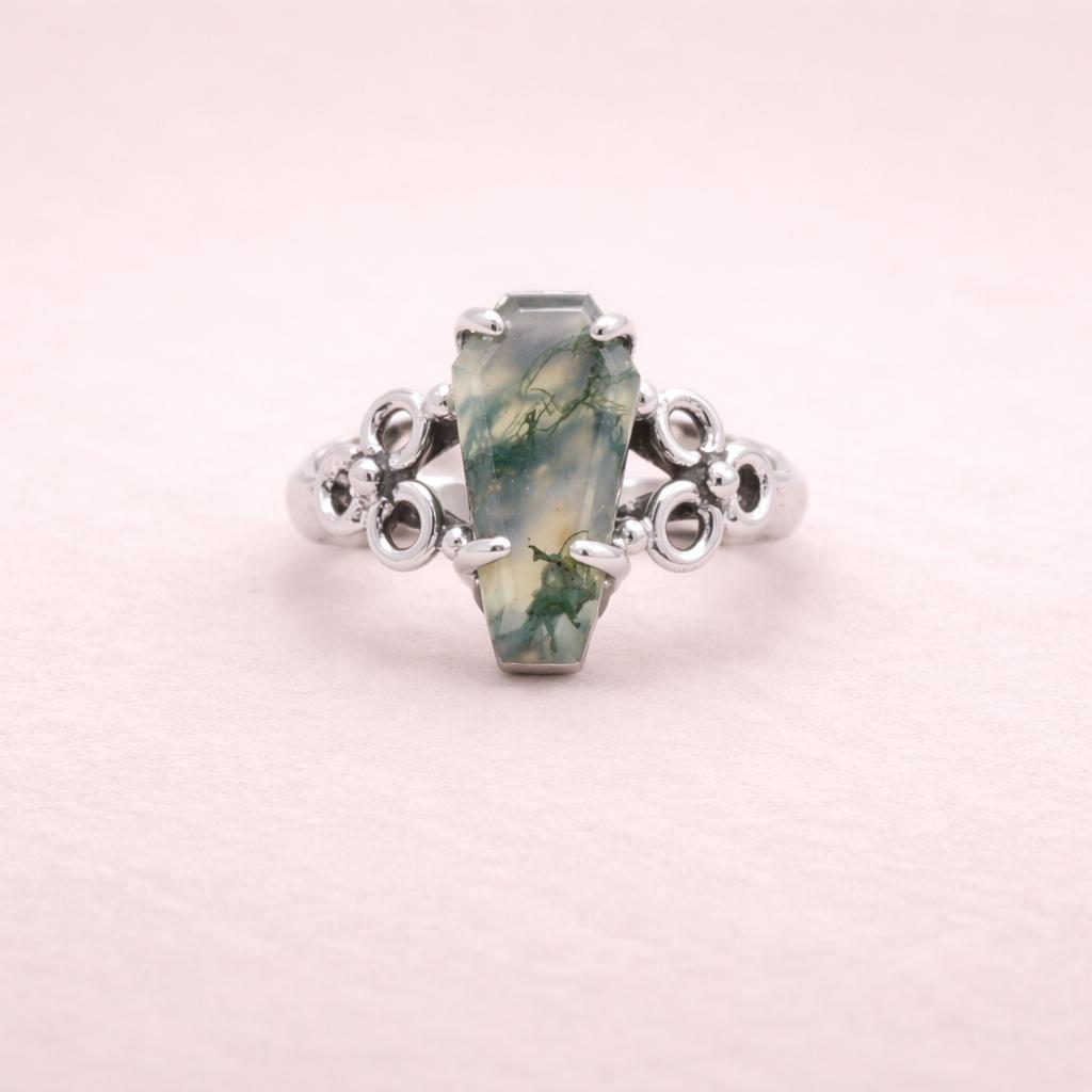 Moss Agate Coffin Ring Sterling Silver 925, Green Gemstone Statement Ring, Natural Moss Agate Boho Gothic Ring
