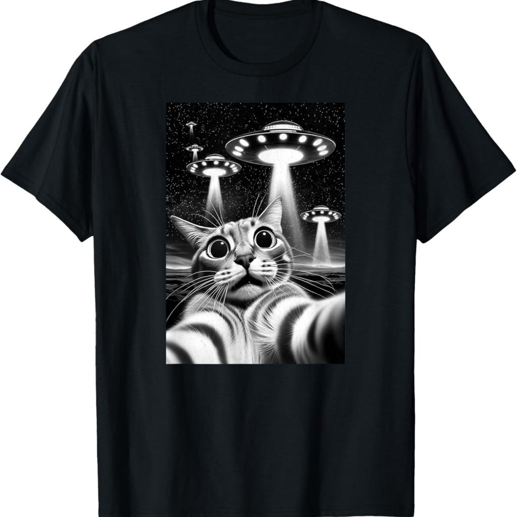 Cat UFO _ Funny Invasion Meme Retro Alien Cat UFO Selfie T-Shirt