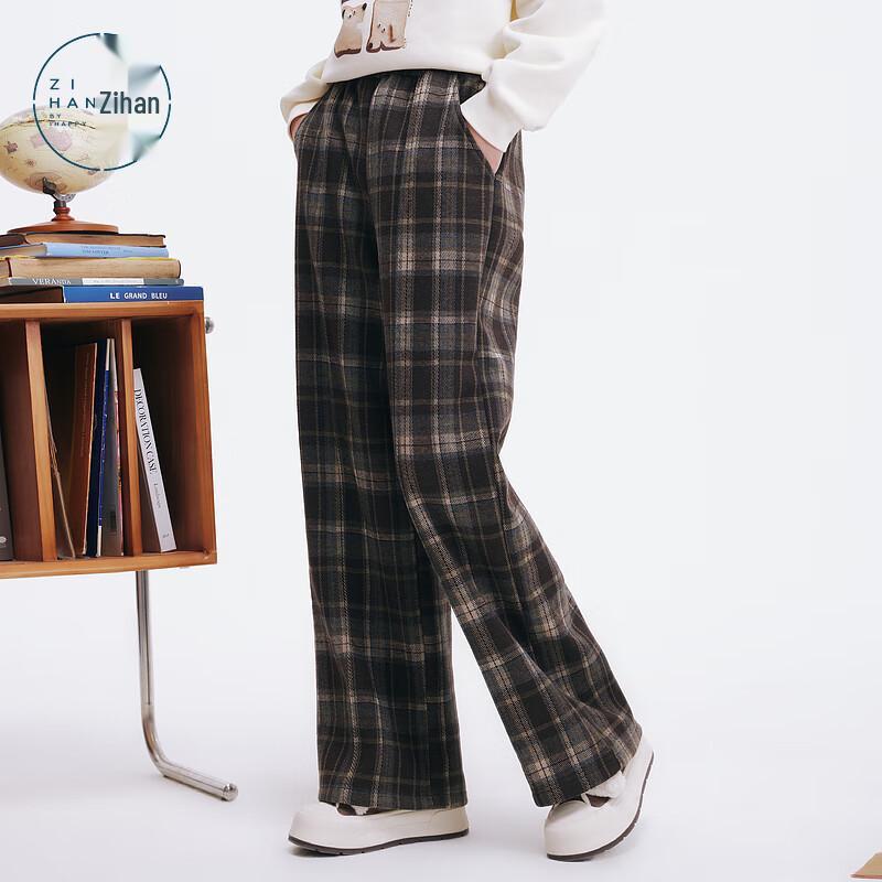 ZIHAN Women's Retro Coffee Plaid Wide-Leg Pants
