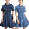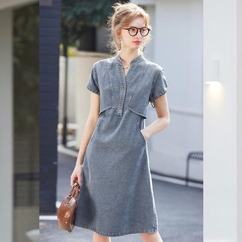Bailuyu Women's V-Neck A-Line Denim Dress with Adjustable Short Sleeves