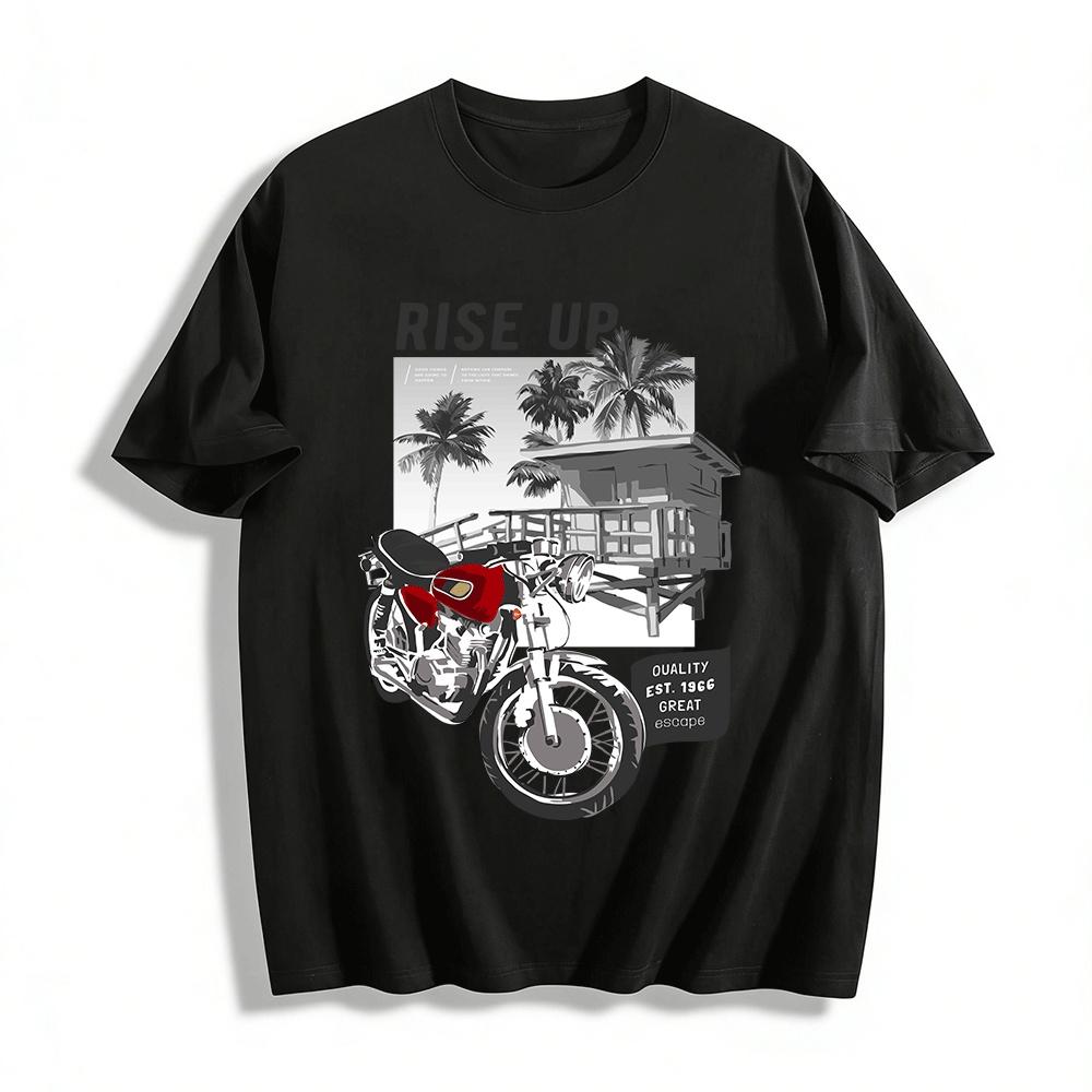 Vintage Motorcycle Coconut Tree Coast Print Summer Casual Tee Pure cotton T-shirt