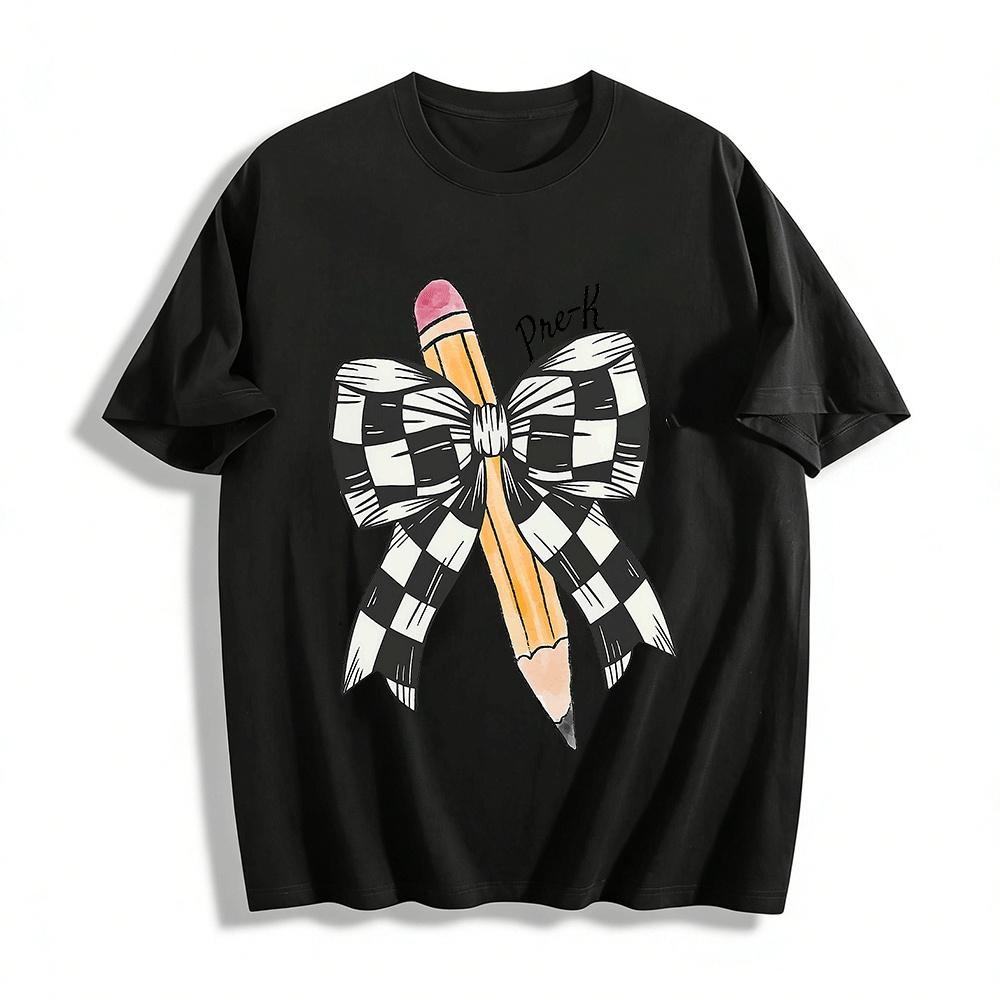 Pre-K Checkered Bow Pencil Print Back to School Kids Tee Pure cotton T-shirt