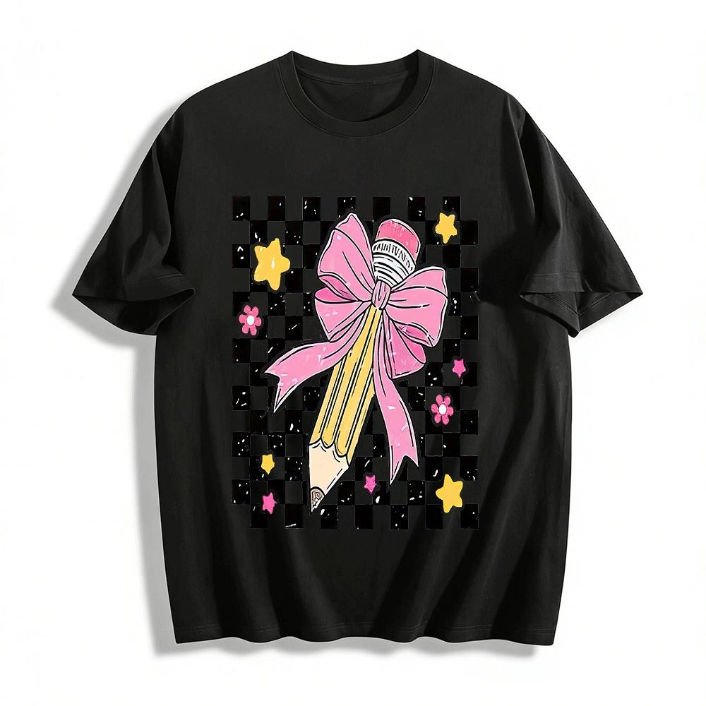 Checkerboard Pencil Bow Print Casual Top Pure cotton T-shirt