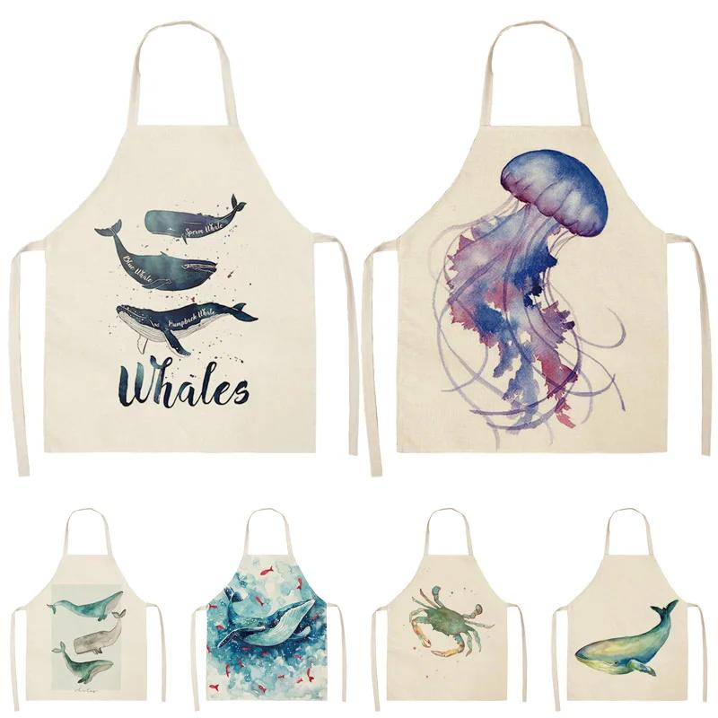 Ocean Animal Whale Jellyfish Pattern Cleaning Aprons Home Cooking Apron Cooking Linen Bibs Waist Baking Kitchen Aprons Delantal