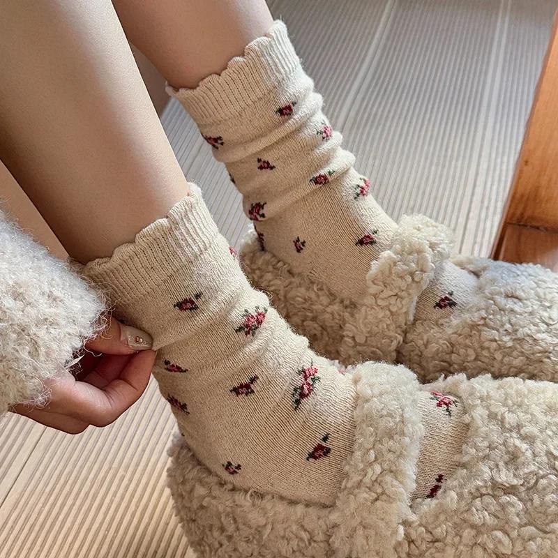 Women's Socks Thick New Retro Fashion Korean Style Wool Warm Socks Casual Novelties Sweet Long Ladies Flower Socks Comfort Cute