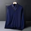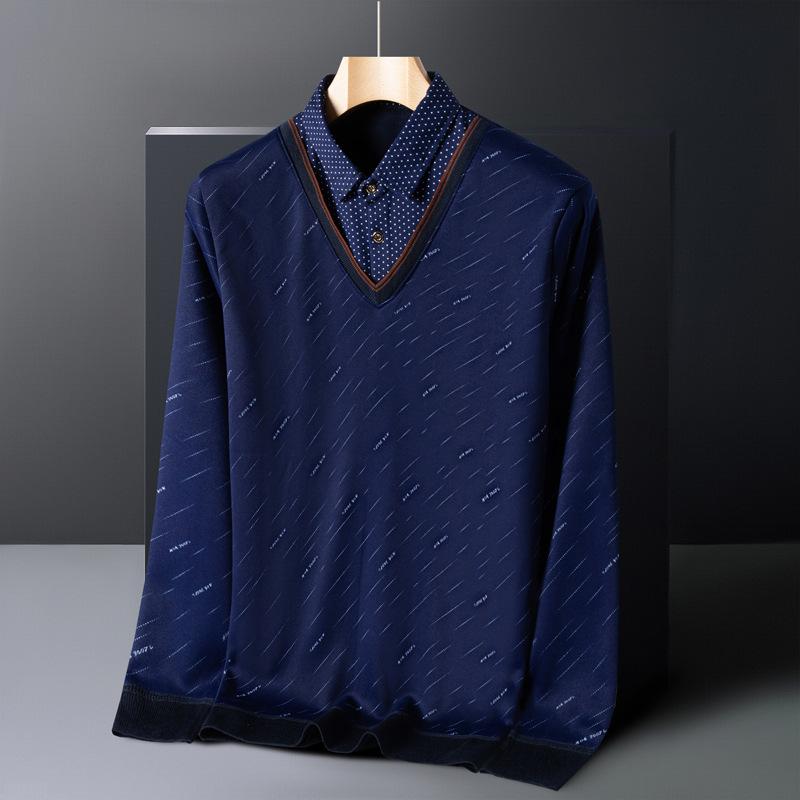 Autumn Winter New Style Men Fake Two Piece Sweater Long Sleeve Middle Aged Fleece Lined Thickened Base Layer Shirt