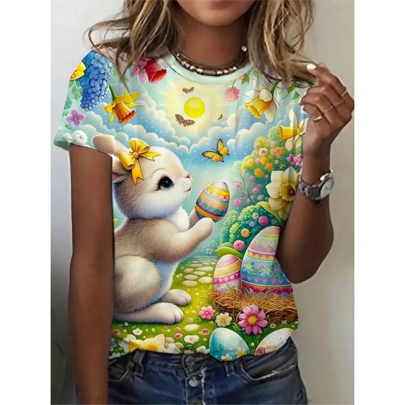 Full color Easter bunny and egg flower women's T-shirt casual short sleeved shirt