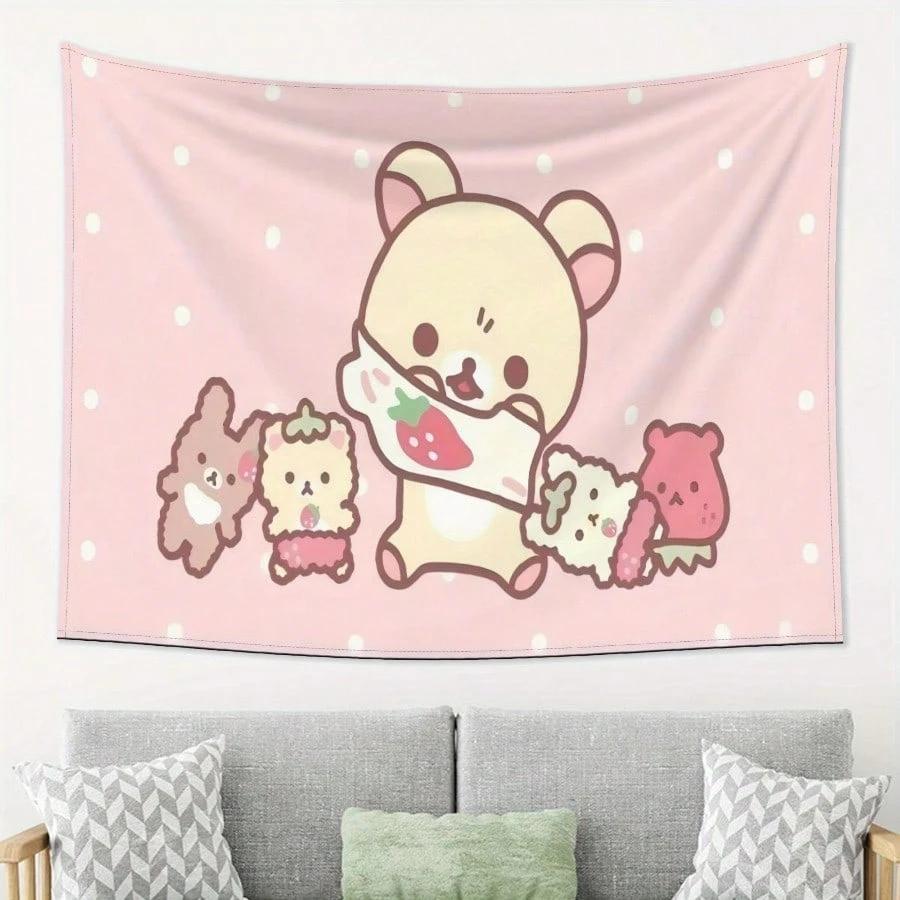 1pc Kawaii Strawberry Bear Tapestry Polyester 2D Print Pink Polka Dot Cute Animal Design Perfect Wall Decor Gift for Bedroo
