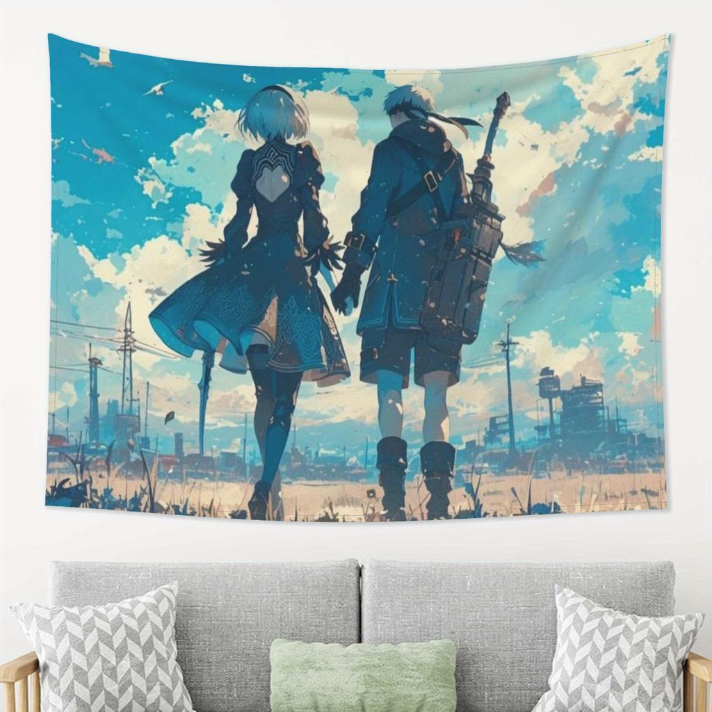 Anime Adventure Tapestry Celebrating Future Romance with Detail Characters and City Landscapes Perfect for Home Decoration