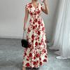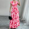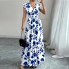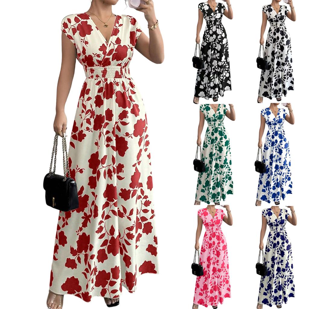 Women's Summer Fashionable Floral Print V-neck Long Dress, Summer Waist Cinching Dress