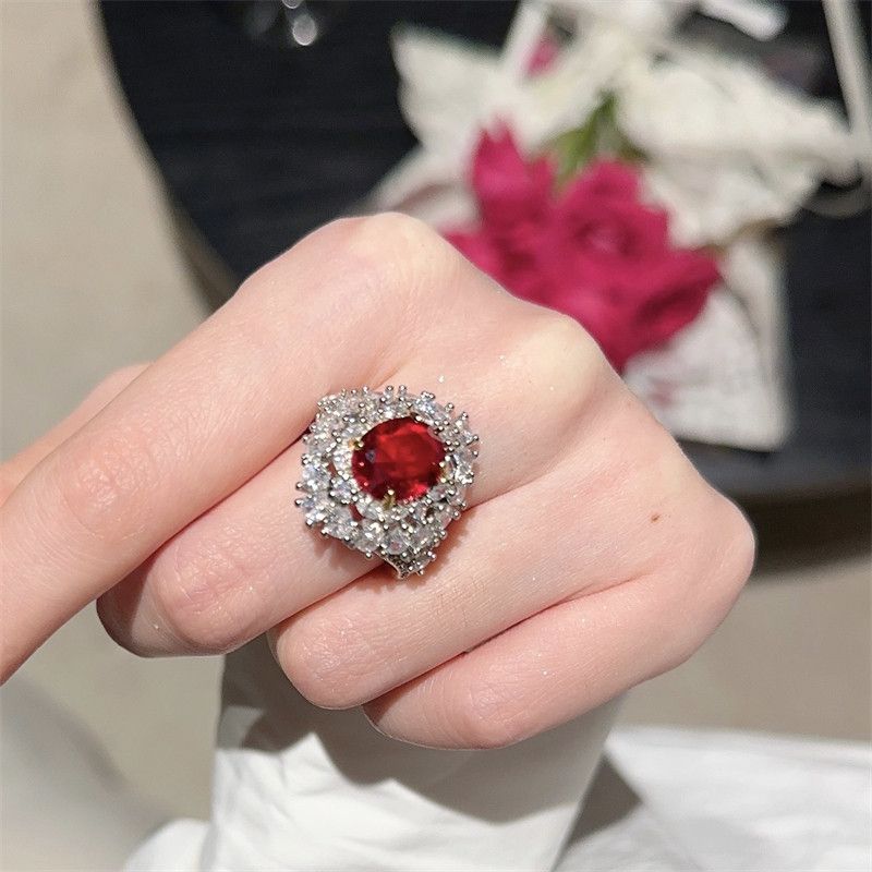European and American Entry Lux Red Wine Stain Rose Ruby Zircon Micro-Inlaid Full Diamond Elegant Fancy Versatile Opening Ring